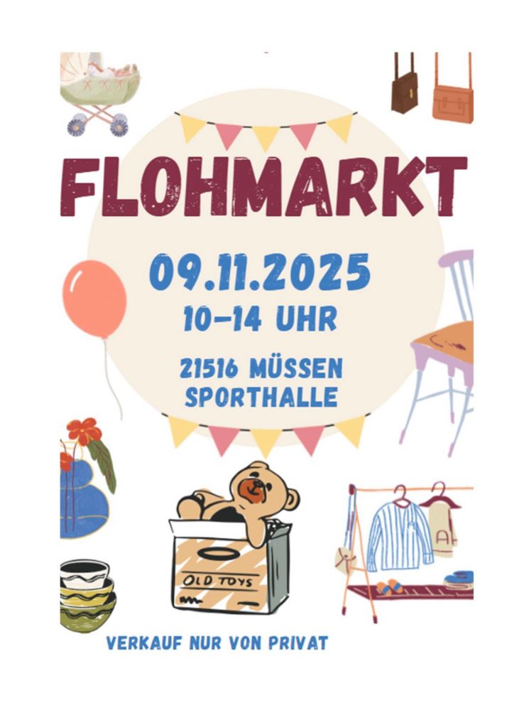 Am Sonntag, den 09. November 2025, findet von 10 bis 14 Uhr in der Sporthalle Müssen unser beliebter Flohmarkt statt.